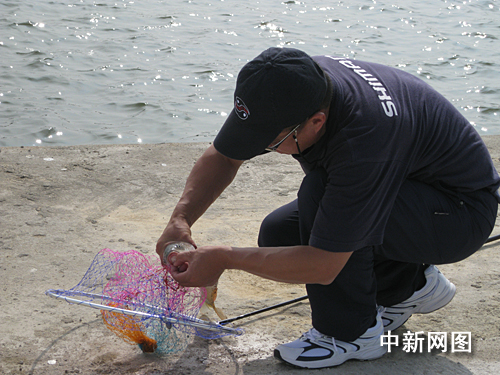 有一名來(lái)自安徽的選手顯然是這路“武功”里的豪放派。當(dāng)魚(yú)急著四處游走想擺脫魚(yú)鉤的束縛時(shí),這位“大俠”卻好整以暇地以單手控竿,巧妙地跟著魚(yú)的力量調(diào)整好釣線的角度,最后猛地使出一個(gè)“拔蔥式”——一條大魚(yú)頓時(shí)從水里“一飛沖天”,頗為委屈地重重拍在了地上。
