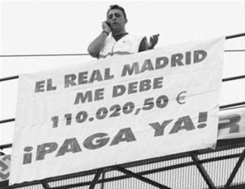 為了從皇馬俱樂部手中拿到這筆工程款,馬修鋁業(yè)公司老板卡洛斯·馬特奧不得不登上起重機(jī)上到高空,并貼出討債大字報(bào),他希望通過這種方式引起全西班牙的關(guān)注,并逼迫皇馬盡早支付這筆款項(xiàng)。