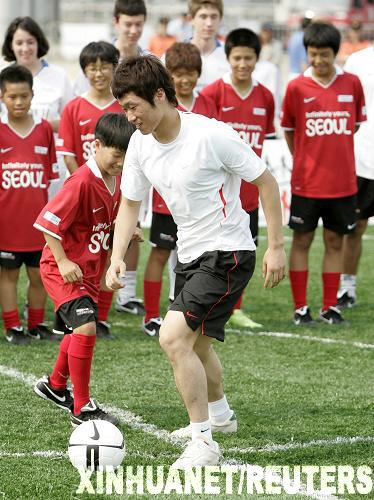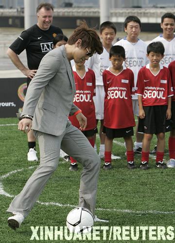 7月23日,英超曼聯(lián)隊(duì)的韓國(guó)球員樸智星在為孩子們展示運(yùn)球技巧。當(dāng)日,樸智星與韓國(guó)藝人Rain在首爾的一個(gè)足球訓(xùn)練營(yíng)為孩子們展示球技。樸智星所效力的曼聯(lián)隊(duì)于今日抵達(dá)首爾,繼續(xù)亞洲之行。球隊(duì)將于7月24日與首爾FC隊(duì)進(jìn)行一場(chǎng)友誼賽。新華社/路透