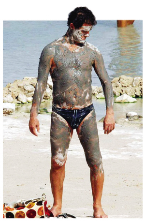 意大利南部小城大多有水溫從32到37攝氏度不等的溫泉,這些景點(diǎn)專門提供一些泥浴治療服務(wù)。來(lái)這里享受休閑的卡佩羅及其妻子就這樣一不小心落入了記者的鏡頭。與比賽場(chǎng)邊的威嚴(yán)姿態(tài)大相徑庭,鏡頭前只穿了一條黑色泳褲的卡佩羅從頭到腳、甚至包括臉部都涂滿了深灰色的泥漿,要不是那一頭標(biāo)志性的卷發(fā),意大利人的身份還真有些難以“識(shí)別”。身邊的勞拉更將泥漿涂抹得辨別不出了比基尼的花色。低頭看看自己身上的“作品”還算令人滿意,63歲的卡佩羅于是走到勞拉身邊,和自己的老婆開起了玩笑。