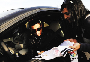 傷勢痊愈即將參賽,也令C羅心情大好。當C羅在結(jié)束訓(xùn)練駕車離開時,受到了皇馬球迷的熱烈歡迎。球迷高舉著他的球衣,呼喊C羅的名字,而C羅也以禮相待,盡量滿足球迷的要求,簽名、合影留念,皇馬頭牌十分有親和力,更是在車里耐心地為一位美女球迷簽名,并且滿足了其合影的要求。換了新發(fā)型,挑染了頭發(fā),帶著太陽眼鏡,穿著閃亮的皮衣,似乎來到了馬德里,和這里眾多的造型達人朝夕相處,C羅的時尚觸覺也更加提升了。