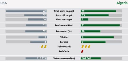 美國(guó)隊(duì)的球風(fēng)也相對(duì)“干凈”,他們?nèi)珗?chǎng)犯規(guī)次數(shù)為11次,而阿爾及利亞隊(duì)為21次。另外,阿爾及利亞吃到3張黃牌,美國(guó)隊(duì)2張黃牌。比賽的最后階段,被美國(guó)隊(duì)絕殺后,阿爾及利亞隊(duì)隊(duì)長(zhǎng)葉海亞吃到第二張黃牌下場(chǎng)。