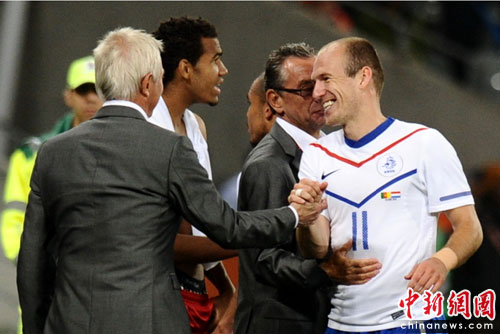 喀麥隆的反攻下半場有聲有色。第61分鐘,莫古恩妙傳馬庫恩形成單刀,不過他的推射被施特倫堡英勇?lián)涑。?5分鐘,范德法特禁區(qū)內(nèi)手球被裁判判罰點球,埃托奧操刀主罰命中,將比分扳為1-2。不過第72分鐘,羅本的登場換下范德法特還是贏得了滿堂彩聲。