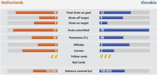 比賽中,荷蘭隊(duì)犯規(guī)17次,斯洛伐克隊(duì)則犯規(guī)19次。黃牌方面也是荷蘭占優(yōu),只有2張黃牌,斯洛伐克隊(duì)得了3張。