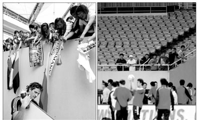 然而,這樣的熱烈氛圍隨著中國(guó)隊(duì)的到來(lái)消散殆盡。當(dāng)?shù)聡?guó)隊(duì)退場(chǎng)、中國(guó)隊(duì)進(jìn)場(chǎng)時(shí),近2000名球迷竟然像潮水退潮一般,轉(zhuǎn)眼就迅速地隨德國(guó)隊(duì)一同離場(chǎng)。一名女球迷在撤退時(shí)向同伴高喊:“中國(guó)隊(duì)來(lái)了,快跑!”最終堅(jiān)持留在體育場(chǎng)看中國(guó)隊(duì)訓(xùn)練的球迷,竟然只有屈指可數(shù)的8個(gè)人。(記者鄭小龍)