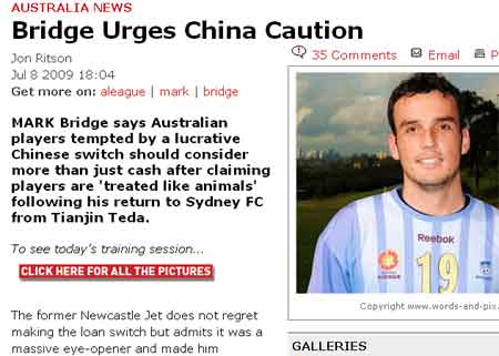 中新網(wǎng)7月9日電 布里奇,一個天津泰達(dá)隊球迷都不會陌生的名字。這位澳大利亞外援曾在本賽季初效力于天津泰達(dá)隊,現(xiàn)在已經(jīng)離開中超加盟悉尼FC隊。日前他在接受澳大利亞《442》雜志采訪時憤怒的回憶了在中超的悲慘生活。他表示,中超的球員就像畜生一樣被對待。