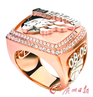 據(jù)鉆戒設(shè)計人員透露,為使設(shè)計更加新穎,在材質(zhì)的挑選上采用了正逐漸成為全球珠寶市場主流的18K玫瑰金,每枚重達40克,頂部鐫刻著廣東隊的隊標(biāo),環(huán)繞以79粒晶瑩的高品質(zhì)鉆石;戒指的右側(cè)面鐫刻著“08-09”的字樣和CBA籃球面孔的標(biāo)志,左側(cè)是球員姓名及球衣號碼;指環(huán)下方用鐳射技術(shù)刻有“戴夢得”的字樣。整個戒指通體造型渾厚穩(wěn)重,溢彩流光,充分表現(xiàn)出冠軍球隊的王者之氣。戒指上的信息全部采用工藝復(fù)雜的分件倒模技術(shù),呈現(xiàn)凸字效果,增加戒指立體感及時尚感。
