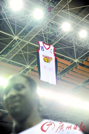 儀式開始前,積臣和宏遠(yuǎn)集團公司董事長一起拉下了遮簾,他的15號球衣在東莞體育館上空高高掛起,這是5冠王俱樂部第一件退役的球衣。