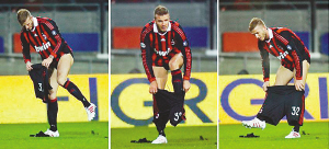 不知是不是太過賣力,動(dòng)作幅度太大,貝克漢姆的球褲在比賽中竟然撕裂了。向裁判申請(qǐng)后,米蘭隊(duì)工作人員將新球褲遞了上來,場上的萬人迷直接站在草地上,一把扯下身上的球褲,扔在地上,再將新球褲穿了上去。整個(gè)動(dòng)作連貫流暢,沒有一絲猶豫,不過在他彎腰的時(shí)候,全場觀眾仍然看到了他的黑色緊身內(nèi)褲下屁股的線條,這遠(yuǎn)遠(yuǎn)比貝克漢姆的腳法更容易讓女球迷激動(dòng)。