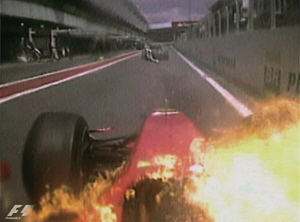 科瓦萊寧在進(jìn)站對(duì)賽車(chē)進(jìn)行修整后在加油管并未拔出的情況下便急匆匆駛離位置,硬生生將輸油管扯斷,導(dǎo)致燃油灑落在后面法拉利車(chē)隊(duì)的萊科寧車(chē)上,由于車(chē)體溫度很高,F(xiàn)60頓時(shí)起火,好在冰人立即擺頭將賽車(chē)駛離正路才避免更嚴(yán)重的事故發(fā)生,而科瓦萊寧在布朗GP車(chē)隊(duì)工作人員的幫助下才卸掉了被扯斷的輸油管。萊科寧回憶那驚險(xiǎn)的一幕時(shí)說(shuō),MP4-24的美孚燃油進(jìn)入了他的眼睛。