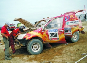 至本報(bào)昨天截稿時(shí),中國(guó)車(chē)手除趙永國(guó)退賽外,只有金城摩托車(chē)隊(duì)的蘇文敏完成了第七賽段的艱苦比賽。而后續(xù)的情況是,汽車(chē)組威麟車(chē)隊(duì)的老將盧寧軍以10小時(shí)1分第32個(gè)完賽,成為當(dāng)天汽車(chē)組中國(guó)車(chē)手中唯一沒(méi)有被罰時(shí)的人。其余3位車(chē)手因?yàn)樵诮M委會(huì)關(guān)門(mén)時(shí)間之后才返回,均被罰12小時(shí)。在不計(jì)被罰時(shí)間的情況下,長(zhǎng)城車(chē)隊(duì)的周勇成績(jī)是15小時(shí)08分45秒,列賽段第44。老盧的隊(duì)友江耀桓用了16小時(shí)38分11秒,賽段成績(jī)第57。興業(yè)銀行酷車(chē)時(shí)代的朱金忠用時(shí)16小時(shí)47分30秒,成績(jī)列第58位。