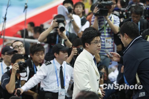 昨天東亞運(yùn)的跳水比賽,當(dāng)現(xiàn)場司儀介紹隊(duì)員名單時(shí),霍啟剛起身走出貴賓室,來到看臺上的貴賓席。此時(shí),記者乘機(jī)進(jìn)了貴賓席,“潛伏”在霍啟剛的后一排,與他的距離不到30厘米。
