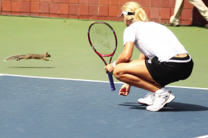 昨天中午,正當(dāng)眾多大腕在訓(xùn)練場進行最后練習(xí)的時候,一只松鼠突然闖入訓(xùn)練場。突然面對這么多人、還有這么多來回移動的網(wǎng)球,受到驚嚇的小松鼠有些不知所措。在場地周圍來回奔跑,甚至橫穿了德娃正在訓(xùn)練的球場。中途,它還遇到一只網(wǎng)球擋路,它還不得不跟網(wǎng)球“搏斗”了一番,引得場外球迷的一片驚訝聲。