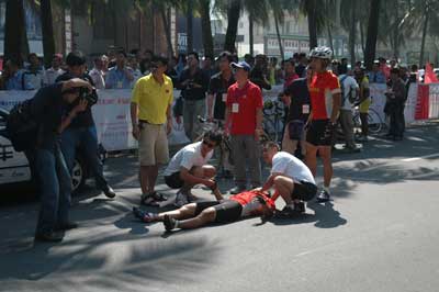 昨天,由海馬汽車贊助的2007環(huán)海南島國際公路自行車賽結(jié)束第三賽段爭奪,雖然本賽段比較平,難度不大,但卻意外發(fā)生中國隊選手惠國與攝影記者碰撞事件。記者昨天采訪了解到,惠國身體多處擦傷,退出比賽的可能性非常大。