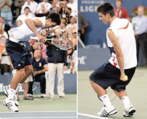 仿休伊特:倒扣網球帽,整理衣領,把項鏈拿到球衣外。慶祝時把球拍交到左手,右手屈到胸前大喊“Come On”。