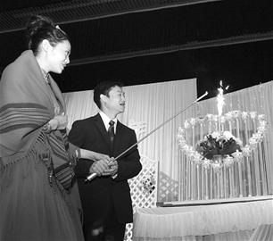 昨日中午楊威攜愛妻楊云回到仙桃答謝父老鄉(xiāng)親,宴會儀式喜慶而簡單。儀式中最引人注目的是,楊威楊云從雙方的母親手中接過火種,一起點亮愛的火焰。