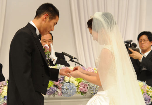 照片=韓聯(lián)社 2002年世界杯上的明星車斗理(左,德乙球隊TuS)于22日下午在首爾論峴洞皇宮飯店同申慧星(音,右)舉行了婚禮。申慧星是該酒店董事長申喆昊的長女。