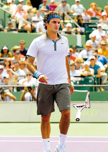 在今晨進(jìn)行的邁阿密索愛(ài)公開(kāi)賽男單半決賽中,費(fèi)德勒摔拍了———在決勝盤(pán)第3局再次打丟一個(gè)機(jī)會(huì)球后,他將球拍往地上重重一砸、拍子立馬報(bào)廢。