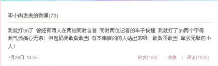 最近福建兩位記者因揭露“紫金礦業(yè)”,結(jié)果在同一天兩位記者的車子同時(shí)被撞。李小冉尤其關(guān)注這則新聞,她在昨日中午的微博中發(fā)飆:“天災(zāi)就夠叫人無(wú)奈的了,人禍也是沒(méi)完沒(méi)了!彼 在微博中爆粗口,引來(lái)粉絲圍觀,認(rèn)為其有損形象。