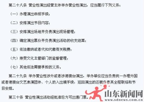 根據(jù)我國09年出臺的最新《營業(yè)性演出管理條例實施細則》第二十八條規(guī)定,營業(yè)性演出經(jīng)營主體舉辦營業(yè)性演出,應(yīng)當(dāng)履行辦理演出申報手續(xù)、安排演出節(jié)目內(nèi)容、接受文化主管部門的監(jiān)督管理等義務(wù)。緊接著,第三十條規(guī)定,營業(yè)性演出活動經(jīng)批準(zhǔn)后方可出售門票。在《細則》中還明確指出,跨省區(qū)演出的,應(yīng)當(dāng)出具其他演出所在地省級文化主管部門的審核意見。
