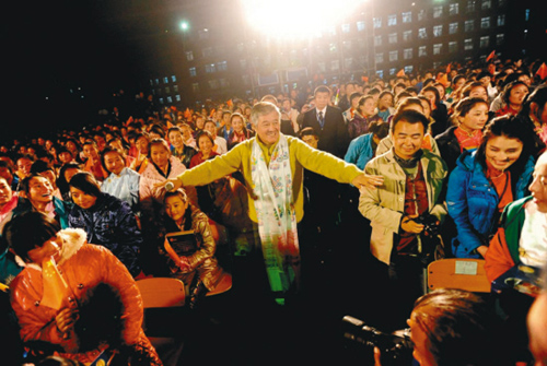 對(duì)于不常走入校園的小沈陽(yáng)來(lái)說(shuō),看到這么多學(xué)生,尤其是來(lái)自青海玉樹災(zāi)區(qū)的藏族學(xué)生,非常興奮。他在現(xiàn)場(chǎng)認(rèn)真地教藏族學(xué)生們唱《我叫小沈陽(yáng)》,字斟句酌,還真像個(gè)老師樣。一名學(xué)生表示:“《我叫小沈陽(yáng)》這首歌以前曾多次聽(tīng)過(guò),但從未面對(duì)面見(jiàn)過(guò)小沈陽(yáng),這回算是見(jiàn)到真的了,見(jiàn)到‘活’的啦!”