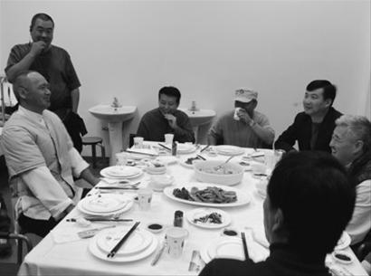 當晚記者趕到片場時,正好是各位大腕們中場休息就餐。也正趕上趙本山的朋友給他送來了一桌子菜,趙本山和老搭檔范偉、導演黃建新等人一起吃了起來,發(fā)哥也在工作人員的帶領(lǐng)下,到這桌來湊個熱鬧,和趙本山對桌而談。