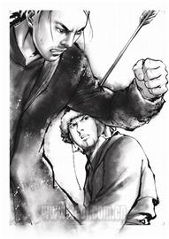 “電腦技術(shù)能很好地解決毛筆技法較難處理的地方”,光祖說,“而且電腦上色快,易修改,效率高 ,有問題可以馬上解決,便利性強(qiáng)。在決定用水墨技法以后,我們用了較長的一段時(shí)間去用電腦體現(xiàn)毛筆的感覺,剛開始的時(shí)候還遇到不少困難,還好到最后還是解決了!彼f:“所有的連載都是用毛筆作底稿,后期再用電腦去潤色,增強(qiáng)國畫效果。在創(chuàng)作初期,毛筆的底稿是必要的,漫畫所有的基調(diào)還是要一筆一劃畫出來,而后期的潤色,則用電腦,這樣互相配合,才能充分發(fā)揮兩者的優(yōu)點(diǎn)嘛!