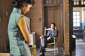 幕后:為了完整重現(xiàn)《色,戒》中30年代場(chǎng)景,李安不惜花了3000萬人民幣在上海搭建了一條完整的“南京西路”,道路兩旁盡是2、3層樓的建筑,共蓋了大小180家商店。據(jù)悉,原著小說中,曾出現(xiàn)店家的陳年照片,李安就根據(jù)這些,再對(duì)照真實(shí)史料,仔細(xì)考究搭建,就連櫥窗內(nèi)的商品也以真品放置。李安對(duì)美工的要求幾乎到了苛刻的地步,連一只杯子都要和當(dāng)年一模一樣。但百密一疏,背景中的高樓影子,本應(yīng)該在后期制作中用電腦刪去,卻疏忽了。