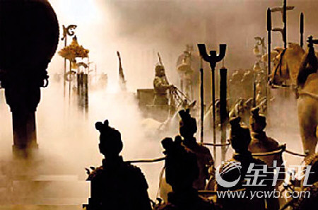 片花放畢,記者們馬上“找茬”。銀幕上一閃而過地出現(xiàn)了地動儀,秦陵里的兵馬俑與戰(zhàn)車混雜在一起,兵俑手頭都有兵器。但地動儀由東漢張衡發(fā)明,秦陵里的兵馬俑和戰(zhàn)車是完全分開羅列的,兵俑都空手無兵器。