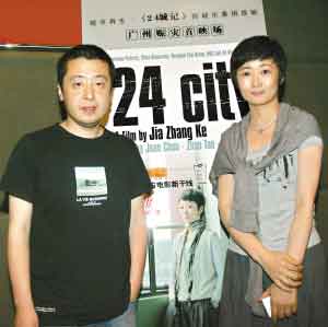賈樟柯和趙濤站在《二十四城記》海報前。