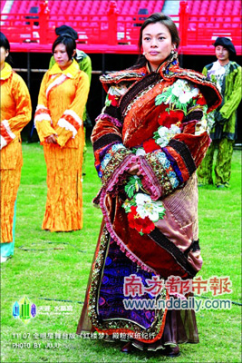 “好男”張殿菲演賈寶玉,《武林外傳》“佟掌柜”閆妮演薛寶釵,斯琴高娃分飾賈母與劉姥姥,溫碧霞、吳佩慈加盟“金陵十二釵”,包涵京劇、昆曲、舞蹈、越劇、歌唱等眾多元素……這些都不是舞臺(tái)劇《紅樓夢(mèng)》的最大噱頭,花團(tuán)錦簇的服裝才是第一主角。港臺(tái)媒體對(duì)這場(chǎng)大戲的報(bào)道重點(diǎn)是:飾演元春的臺(tái)灣明星吳佩慈不敵十公斤重的頭飾,在演出謝幕時(shí)失去重心整個(gè)人蹲在臺(tái)階上,相當(dāng)狼狽。早有觀看現(xiàn)場(chǎng)的網(wǎng)友質(zhì)疑,“吳佩慈扛得動(dòng)那身衣服和頭飾嗎?像要壓趴下了! (記者 徐詞 實(shí)習(xí)生 王甜彬)