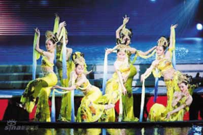 在今年春晚上,舞蹈《飛天》引人關注:七名仙女打扮的舞蹈演員站在升降舞臺上,用肢體配合音樂演繹出敦煌壁畫中的飛天形象,配合著舞臺上飄落的花瓣和臺下噴涌而出的水花,一起將觀眾引入“仙境”。