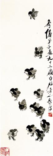 一代宗師喜不自勝,老懷大慰。故此每每含笑捋須,捉筆揮灑,欣欣然在自己得意門生的畫幅上頻添妙筆,并作題記:“秀儀弟子畫貓之墨色為白石所添”;“秀儀女弟子畫小雞七只,老人多事,再添五只!痹圃。