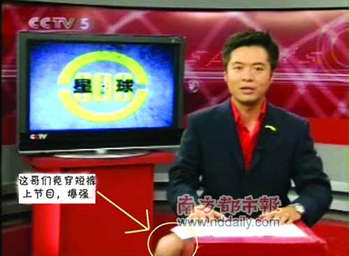 2007年8月13日,在直播《天下足球》時(shí),上半身身著西裝的主持人段暄卻在播音桌下伸出一條沒(méi)穿西褲的腿。
