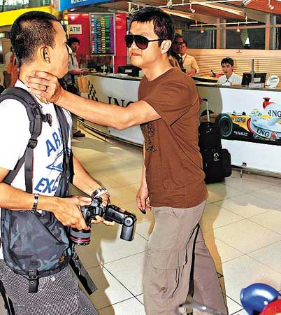 中新網(wǎng)7月24日電 梁朝偉和劉嘉玲日前在不丹完婚后,出席婚禮的嘉賓昨日已轉(zhuǎn)飛曼谷各自打道回府,王菲拖兩歲小女兒李嫣、大女竇靖童和丈夫李亞鵬到達(dá)曼谷機(jī)場(chǎng)時(shí),李亞鵬為護(hù)妻女突然發(fā)火,手腳并用連打三記者,打人后他仍怒氣地說(shuō):“我見(jiàn)到一次會(huì)打他一次!