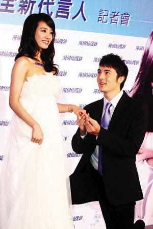 蔡依林前天為洗發(fā)水代言披婚紗,化身美嬌娘的她與廣告中的男友舉辦世紀(jì)婚禮。廣告中的帥哥男友下跪幫她戴婚戒,蔡依林感覺(jué)自己很幸福。