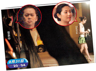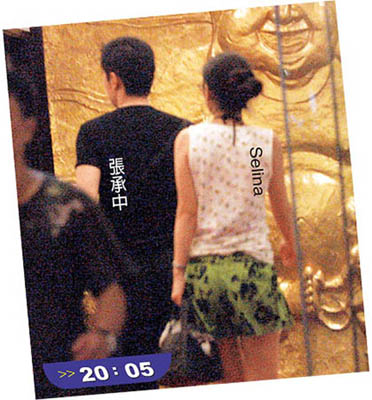 八月三十一日晚間八點,張承中開著Selina的車來到臺北市敦化南路上的“驥園川菜館”,穿著短裙白背心的Selina則從副駕駛座下車,刻意低著頭走進餐廳,而一身黑色休閑服的張承中,將車鑰匙交給泊車小弟后,也跟著Selina走進餐廳,一路不停盯著遠方看有無狗仔車,非常謹慎小心。