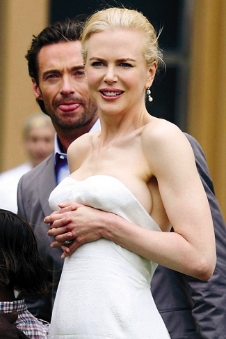 也許是太過放松,妮可·基德曼在向影迷們揮手致意的時候,身上穿的白色露肩晚禮服竟然悄然下滑,令其胸部走光,她驚覺后趕緊雙手護(hù)胸。