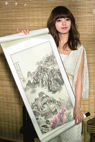 昨天,歌手阿蘭在北京展示吳宇森贈送給她的水墨畫《長城春色》。阿蘭還透露,《赤壁(下)》的主題曲為《大江東去》,由日本作曲家?guī)r代太郎操刀。吳宇森夸阿蘭唱出了電影的豪情。記者張偉 易東方 攝