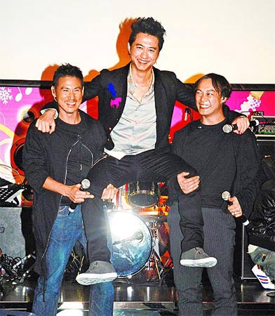 哈林(中)用工作療傷,昨發(fā)片記者會(huì),好友張學(xué)友(左)、陳奕迅力挺同臺(tái)演唱