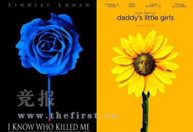 簡(jiǎn)單的畫面,開得正旺的鮮花上若隱若現(xiàn)著一張臉,干凈利落。不過不要以為換了顏色,我們就看不出了。當(dāng)然,黑底藍(lán)花渲染了《我知道誰(shuí)殺了我》的恐怖氣氛,向日葵讓《爸爸的女兒》溫暖的主題更深入人心。