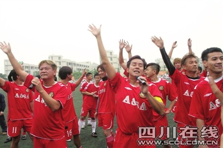 下午5時(shí),義賽結(jié)束,現(xiàn)場(chǎng)出現(xiàn)感人一幕:災(zāi)區(qū)的11個(gè)學(xué)生,舉著寫有“災(zāi)區(qū)學(xué)子謝謝您!感恩奮進(jìn)!”的大牌子來(lái)到球場(chǎng)中間,以示謝意。在地震當(dāng)天出生的10個(gè)孩子,與明星們結(jié)上幫助對(duì)子。