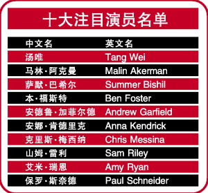 此次入圍十大注目演員的還有西部片《決斗猶馬鎮(zhèn)》的本•福斯特,他在影片中飾演反派羅素•克洛的手下,奸得令人心寒;之前,他還參演過《X戰(zhàn)警3》,飾演一名長有翅膀的戰(zhàn)警。此外,入圍的還有主演傳記電影《Control》的男主角山姆•雷利、本•阿弗列克導(dǎo)演處女作《失蹤人口》的女星艾米•瑞恩、與布拉德•皮特同臺(tái)演出《刺殺神槍手》的保羅•施奈德等。