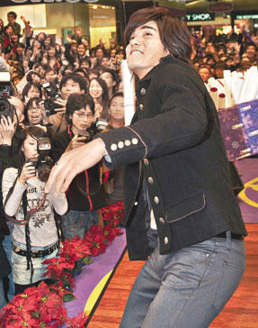據(jù)香港太陽報報道,臺灣人氣偶像賀軍翔(小美)前晚與鐘嘉欣及徐子珊等到上水廣場出席倒數(shù)活動,吸引百人逼爆商場,場面熱鬧。小美出盡“媚”功,與Fans重演劇集《惡魔在身邊》及《玩玩愛》的經(jīng)典場面,包括拖手共舞、跪地求婚、甜蜜互喂及用衫為Fans遮風(fēng)擋雨。由于小美于上月二十八日生日,F(xiàn)ans以普通話及英語唱生日歌祝賀!