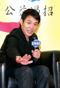 中新網(wǎng)6月3日電 據(jù)臺(tái)灣“東森新聞”報(bào)道,功夫巨星李連杰這次到臺(tái)灣不宣傳電影,他推廣的是一元行善;2日晚間他走進(jìn)政大EMBA講堂,在臺(tái)灣的企業(yè)精英和教授面前,足足說(shuō)了兩個(gè)小時(shí),而且他有問(wèn)必答,風(fēng)趣的言談成功的把一元行善的想法,介紹給在場(chǎng)的政大師生。