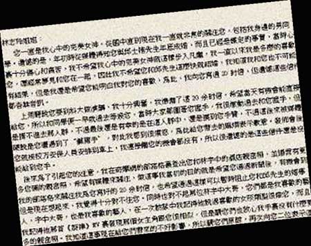 綜合臺(tái)灣媒體消息,日前林志玲與林宇中在酒店“親吻照”在網(wǎng)絡(luò)瘋傳,該爆料者還欲以300萬(wàn)臺(tái)幣高價(jià)拍賣兩人更多的親密照,將這段似是而非的戀情推向最高潮。就在事態(tài)變得撲朔迷離之際,該名爆料者于24日在臺(tái)灣人氣論壇發(fā)表了《致林志玲姐姐的道歉信》,就自己的所作所為向林志玲和林宇中表示道歉,這封道歉信還向人們解開(kāi)了林志玲酒店“親吻照”和遭遇“咸豬手”事件背后的諸多疑問(wèn)。