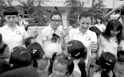 這支明星隊伍很特別:除了劉孜以外,其余都是年輕媽媽,因此特別要求探望災(zāi)區(qū)的小朋友們。一行人早上8點(diǎn)半從成都出發(fā),接近中午時才抵達(dá)梓潼的兒童福利院。孫莉和黃磊的女兒多多已經(jīng)快2歲半了,看到這些天真無邪的孩子,孫莉特別心疼,一個勁兒地往他們手里塞各種小禮物。而很久沒出來唱歌的陳明,還自己掏錢給孩子們買了好多彩色橡皮泥。在永安小學(xué)陳明借來一個擴(kuò)音喇叭,汗流浹背地唱起那首《快樂老家》。今天,愛心媽媽們還將前往德陽的兒童福利院繼續(xù)她們的“獻(xiàn)愛行動”。(記者 喬雪陽 攝影 楊剛)