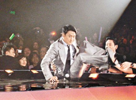 黎明下臺馬上被淹沒在人海中,嚇得他極速返上臺。(香港“太陽報”圖)