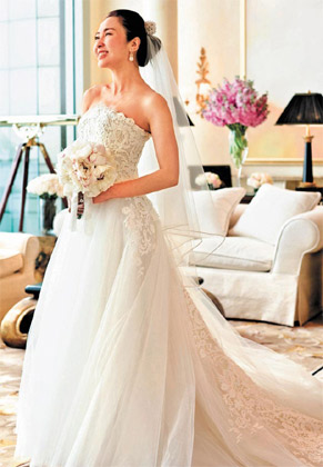 昨日黎姿透過無線發(fā)了兩款婚照,分別是一襲婚紗和一襲粉紅晚裝,雖未見丈夫馬廷強在旁,但黎姿笑容甜絲絲。據(jù)知這輯相是黎姿和丈夫設(shè)宴前一天提早入住酒店補拍的,由著名攝影師張文華操刀。