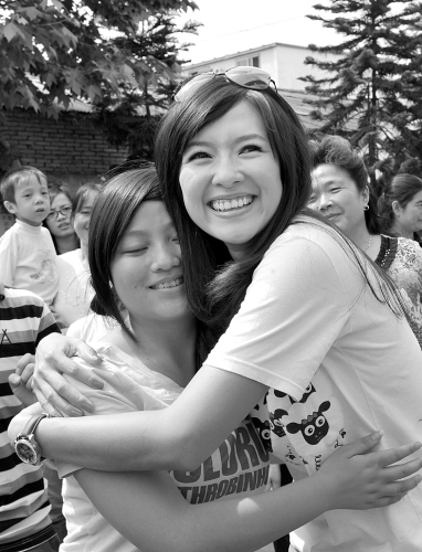 這時(shí),一個(gè)孩子擠近章子怡身邊。章子怡問道:“小朋友,你叫什么名字?”旁邊的吳院長立即說:“子怡,這孩子有先天性聾啞,耳朵聽不見!闭伦逾p眼閃出一絲淚花,她伸出雙手立即將孩子緊緊擁抱。之后,她拿出了精美的筆記簿禮物,一一送到孩子們手上。